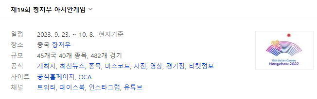 - 19회 항저우 아시안게임은 2023년 9월 23일부터 10월 8일까지 중국항저우에서 45개국 40개 종목, 482경기로 개최된다.